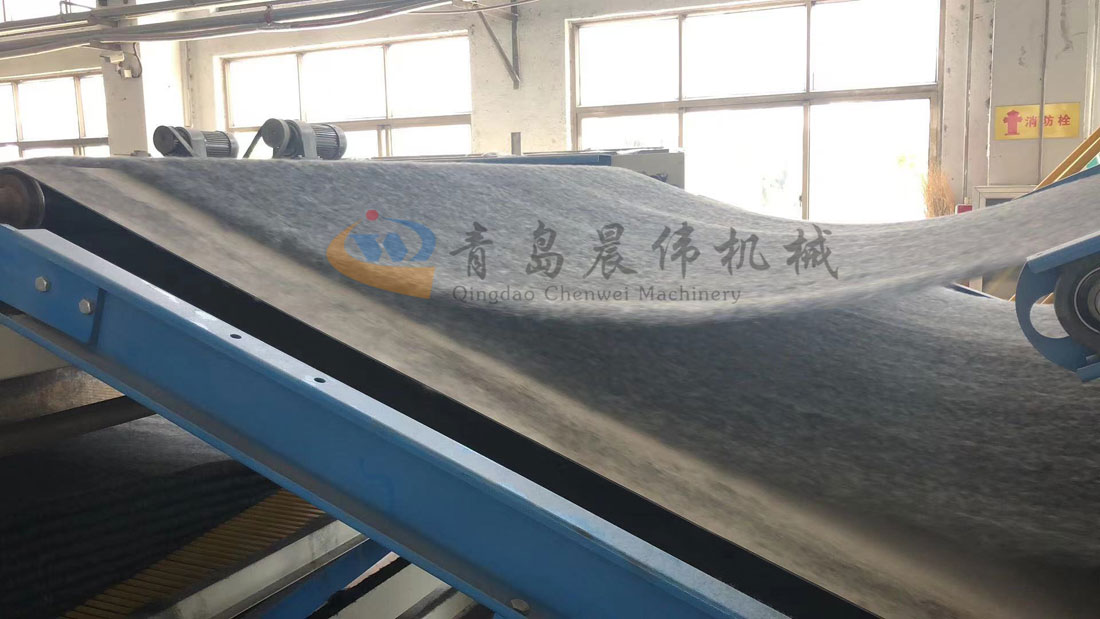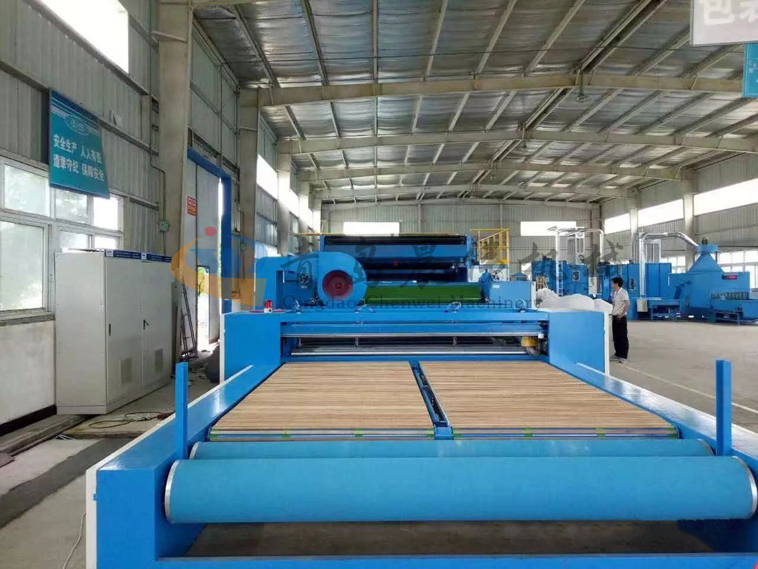 5. CWPW-鋪網(wǎng)機(jī):用于將梳理纖網(wǎng)通過移動小車交叉折疊為所需幅寬和定量的多層纖網(wǎng),以供后道工序使用。鋪網(wǎng)輥采用特殊結(jié)構(gòu),加裝壓網(wǎng)輥和導(dǎo)流板,不飄網(wǎng)不起皺,五只大功率電機(jī)精確控制各部件的運動,電動輸出簾高度調(diào)節(jié)裝置